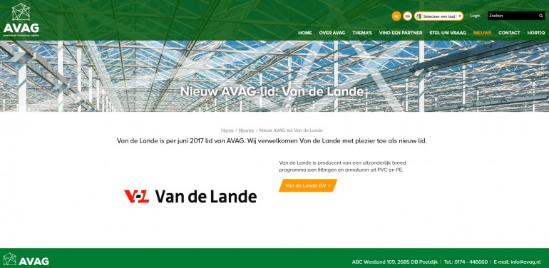 Lesen Sie mehrVan de Lande ist im Juni 2017 AVAG-Mitglied geworden.AVAG ist die Vereinigung des niederländischen Gewächshausbaues und der Technik. Die Niederlande sind weltweit anerkannter Anbieter von...