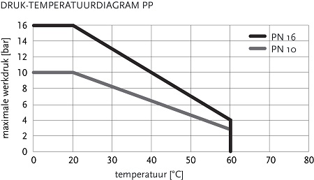 Figure 1 Figure 1 shows the maximum operating pressure for PN16, PN10 and PN6 fittings. This information is based on a lifespan of 50 years with a safety factor of 2.5.